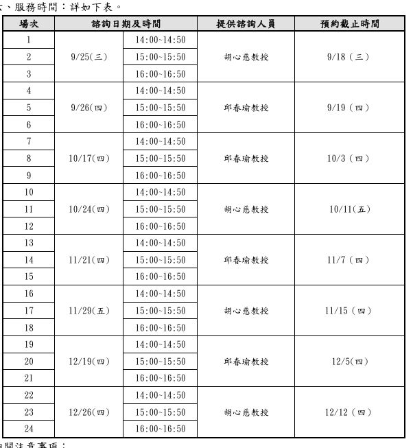 二、 諮詢當日,請提早10分鐘報到。逾時15分鐘者,將取消資格;當日已預約諮詢但 未出席且無事先來電告知者,本中心有權於日後調整申請順位或不予受理。