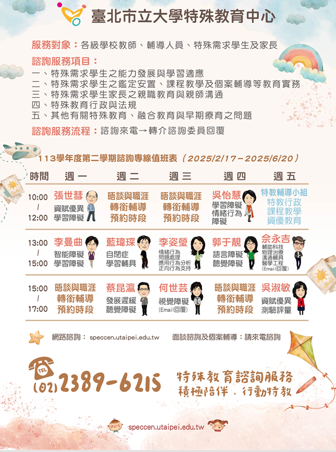 臺北市立大學特殊教育中心提供特殊教育電話諮詢服務 (02-23896215)、網路諮詢服務、個案晤談與輔導服務、 到校輔導服務以及特教知能研習等多元服務。