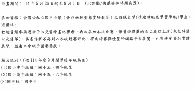 為鼓勵特殊氣質青少年發揮創意,籍由繪畫抒發心情,穩 定情緒,從繪畫中獲得成就感、自信心及樂趣,並展現其 才華,社團法人台灣赤子心過動症協會總會辦理繪畫 比賽。