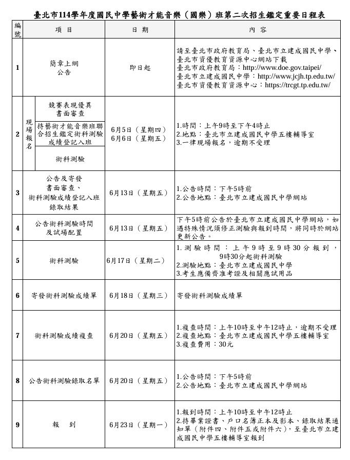 臺北市114學年度藝術才能音樂(國樂)班第二次招生簡章