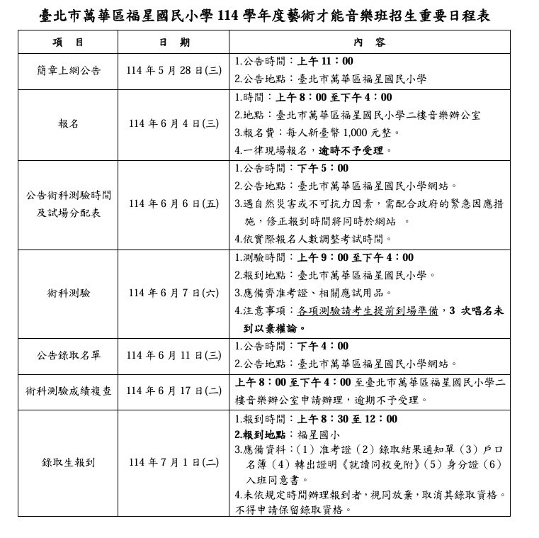 福星國小_114學年度藝術才能 `音樂班` 招生簡章